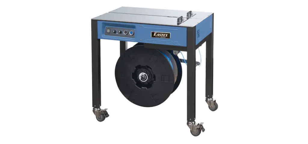 Easteyโs EXS-100 is an example of a semi-automatic strapper. The EXS-100 comes with a bottom seal design that is ideal for low to medium volume users who need additional security beyond case taping. In addition, the EXS-100 features electronic tension control, allowing the user to adjust the proper tension for a wide variety of packages, and the heated strap-weld sealing system ensures a secure strap.