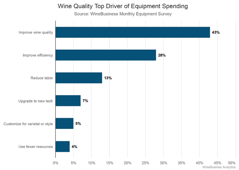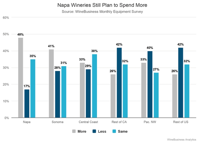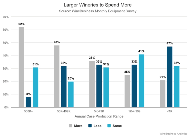 Among limited production wineries that produce fewer than 1,000 cases, 47% said they would be spending less while one-third of wineries that produce between 1,000 and 5,000 cases also expected to spend less on equipment this year.